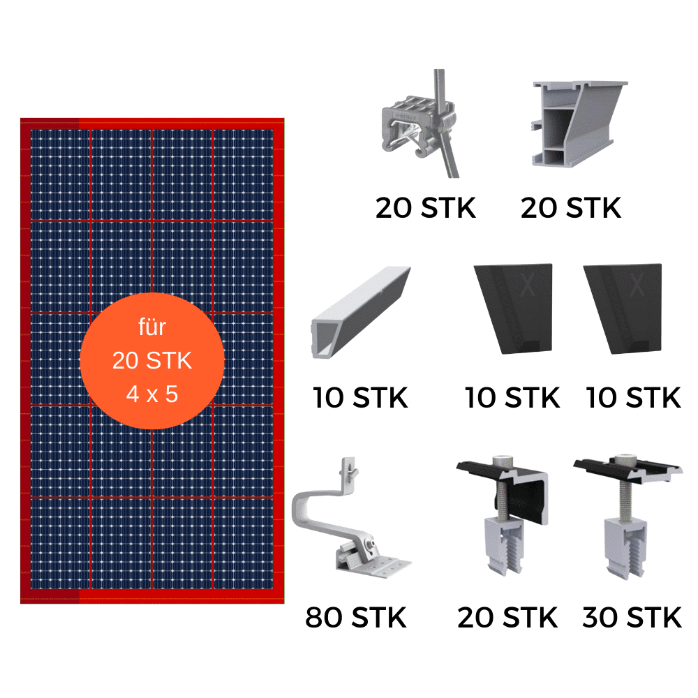 Sie können gerne vereinzelt Mengen erhöhen, aber nicht unter die vorgeschlagene Mindestmenge bestellen. Dies ist ein Bestellvorschlag für ein Montage Set für 20 PV-Module in 4×5 stehend Anordnung auf einem Ziegeldach.
