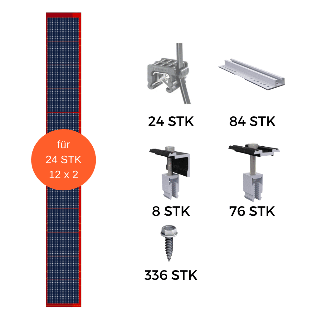 Sie können gerne vereinzelt Mengen erhöhen, aber nicht unter die vorgeschlagene Mindestmenge bestellen. Dies ist ein Bestellvorschlag für ein Montage Set für 24 PV-Module in 12×2 liegend Anordnung auf einem Trapezblechdach.