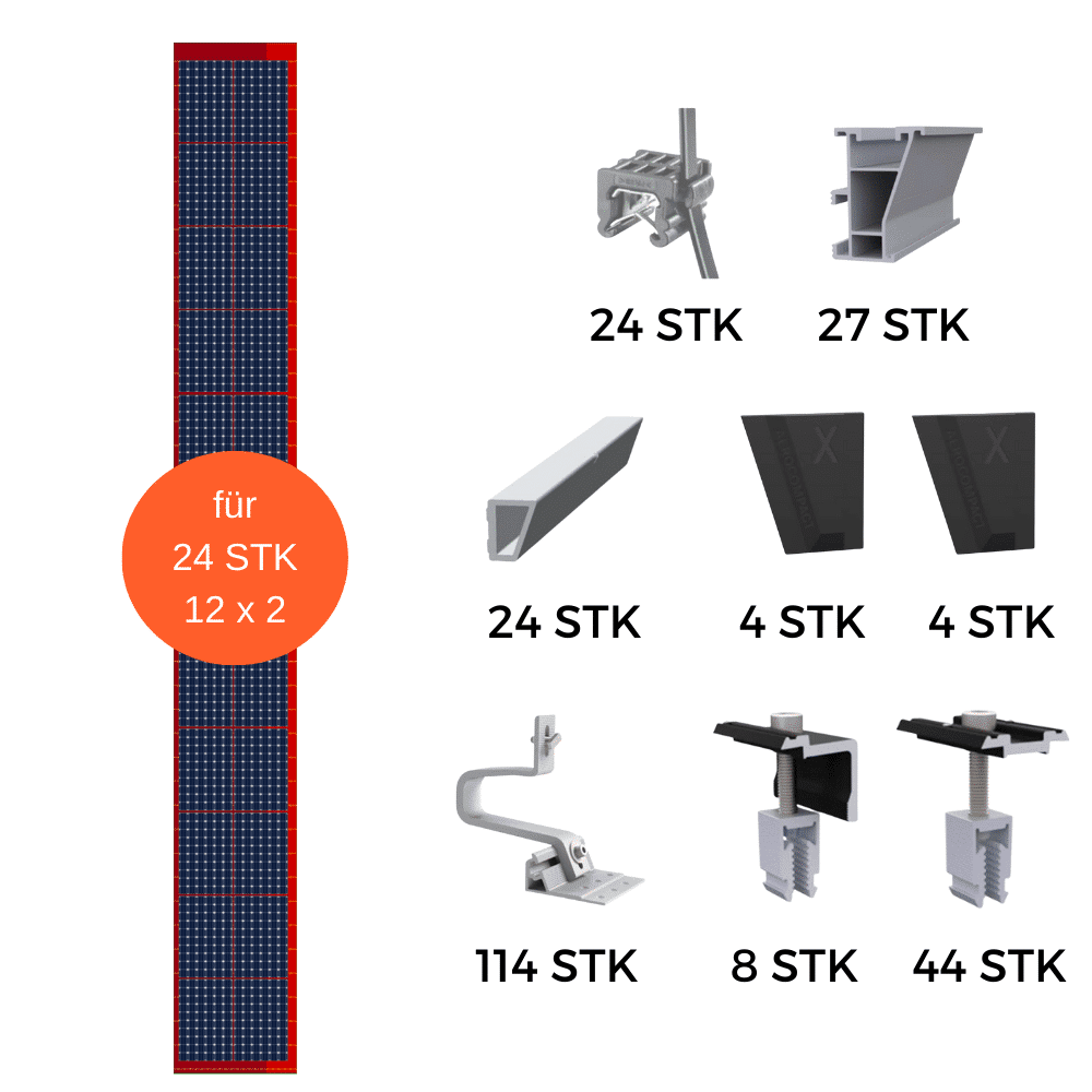Sie können gerne vereinzelt Mengen erhöhen, aber nicht unter die vorgeschlagene Mindestmenge bestellen. Dies ist ein Bestellvorschlag für ein Montage Set für 24 PV-Module in 12×2 liegend Anordnung auf einem Ziegeldach.