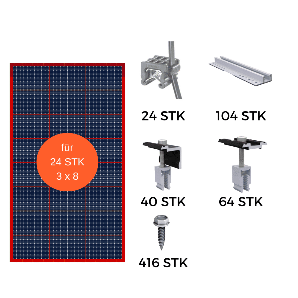 Sie können gerne vereinzelt Mengen erhöhen, aber nicht unter die vorgeschlagene Mindestmenge bestellen. Dies ist ein Bestellvorschlag für ein Montage Set für 24 PV-Module in 3×8 liegend Anordnung auf einem Trapezblechdach.