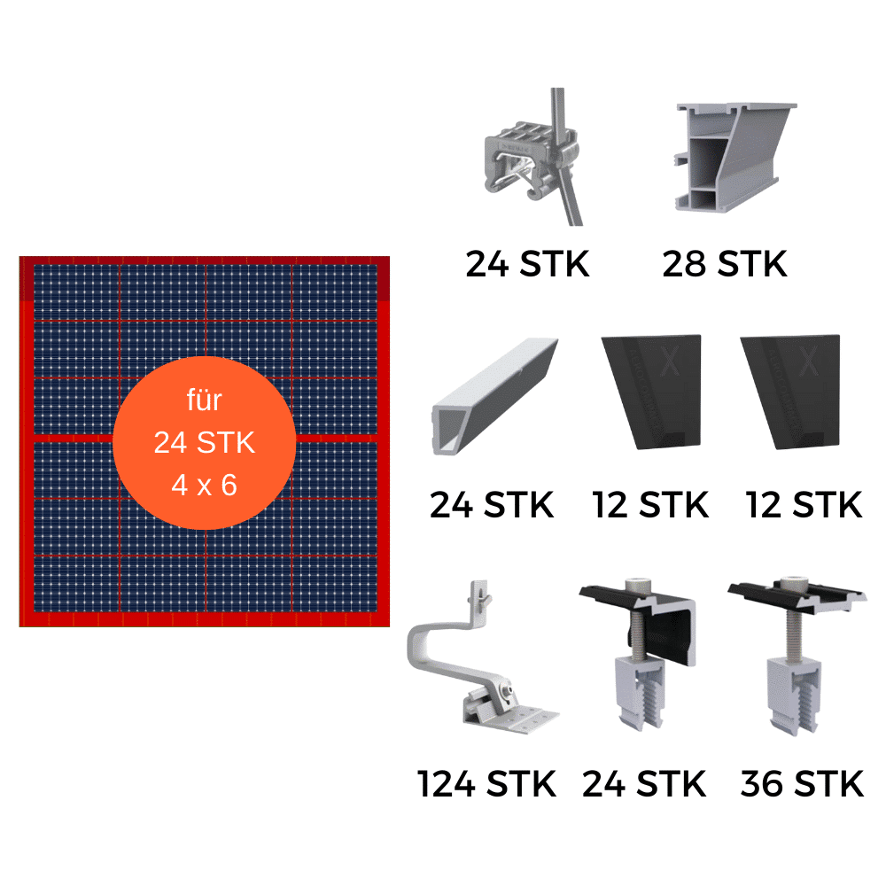 Sie können gerne vereinzelt Mengen erhöhen, aber nicht unter die vorgeschlagene Mindestmenge bestellen. Dies ist ein Bestellvorschlag für ein Montage Set für 24 PV-Module in 4×6 liegend Anordnung auf einem Ziegeldach.