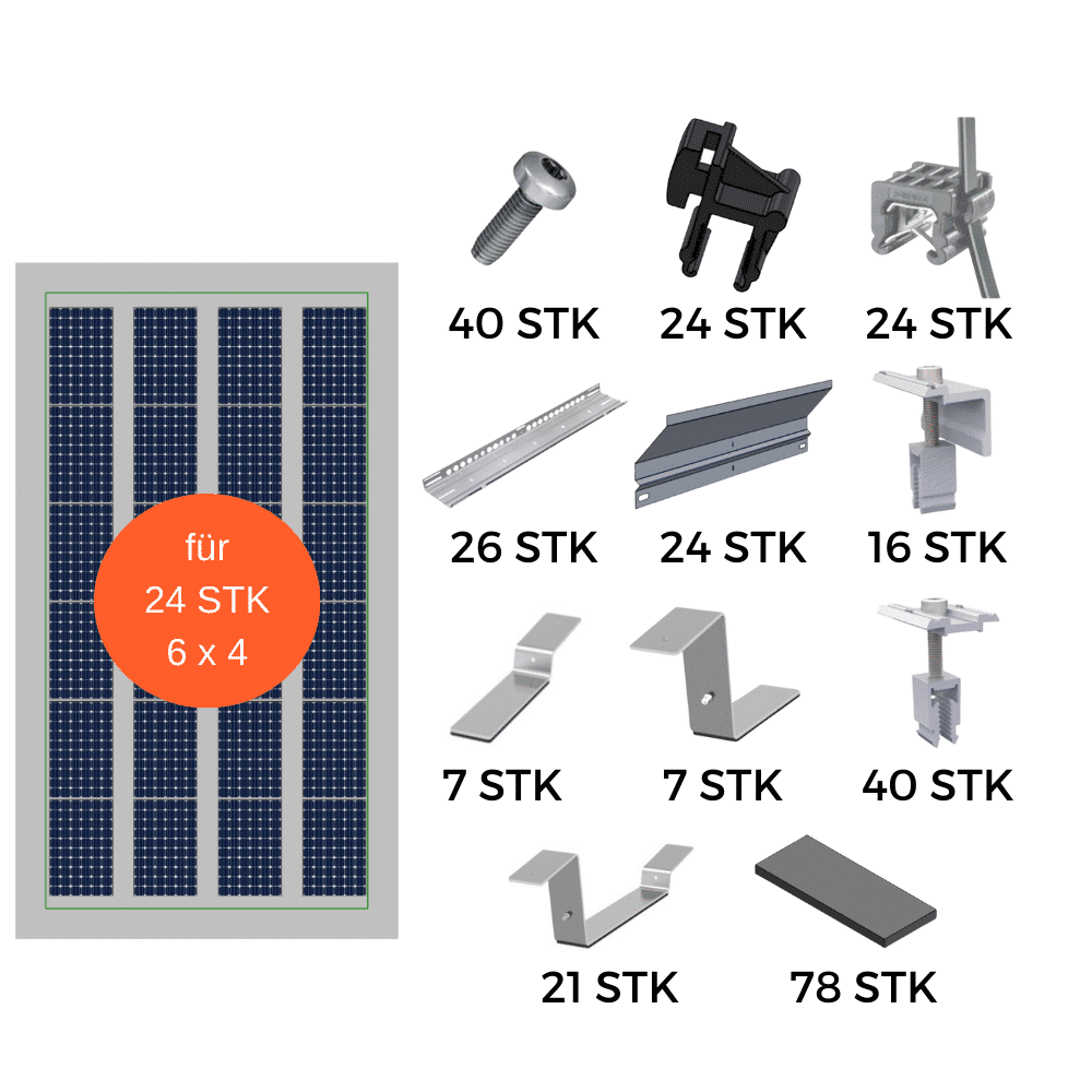 Sie können gerne vereinzelt Mengen erhöhen, aber nicht unter die vorgeschlagene Mindestmenge bestellen. Dies ist ein Bestellvorschlag für ein Montage Set für 24 PV-Module in 6×4 liegend Anordnung auf einem Flachdach.