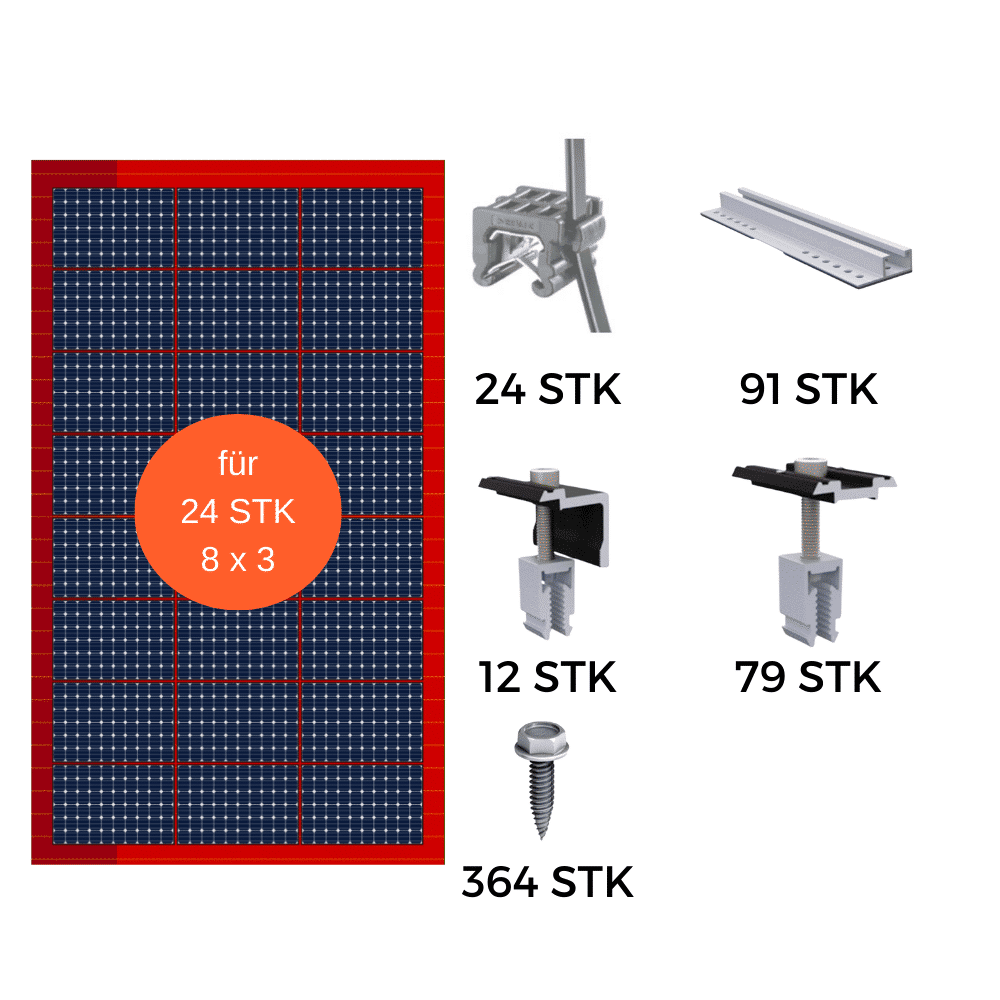 Sie können gerne vereinzelt Mengen erhöhen, aber nicht unter die vorgeschlagene Mindestmenge bestellen. Dies ist ein Bestellvorschlag für ein Montage Set für 24 PV-Module in 8×3 stehend Anordnung auf einem Trapezblechdach.
