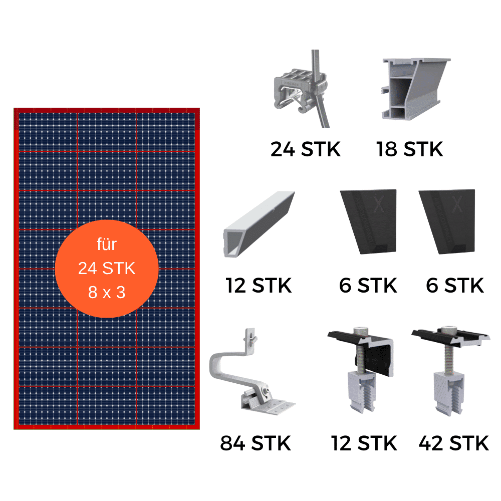 Sie können gerne vereinzelt Mengen erhöhen, aber nicht unter die vorgeschlagene Mindestmenge bestellen. Dies ist ein Bestellvorschlag für ein Montage Set für 24 PV-Module in 8×3 stehend Anordnung auf einem Ziegeldach.